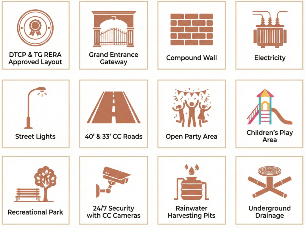 The carefully selected amenities in Sree Laxmi Balaji Township are intended to improve daily living. The project creates a calm and orderly atmosphere with its grand entrance, broad internal roadways, subterranean utilities, beautifully landscaped parks, kid-friendly play places, and avenue plantation. In addition to outdoor sports courts and jogging/walking tracks, a contemporary clubhouse with a gym, swimming pool, indoor games, and multipurpose hall guarantees the ideal balance of comfort, leisure, and active community living.